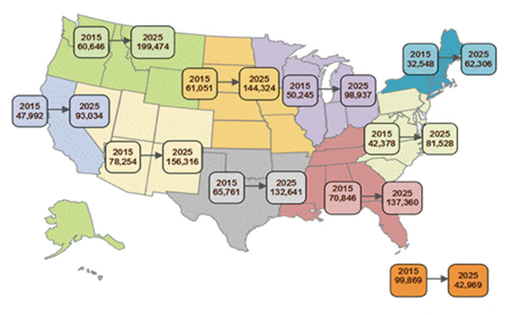In fact, the 2015 Workforce Study paints a startling picture of the rheumatology workforce in the next 10 years. It projects a shortage of 3,845 rheumatologists in the U.S. by 2025, an increase from the 2005 ACR Workforce Study, which projected a shortage of 2,576 rheumatologists. A declining rheumatology workforce resulting from significant baby boomer retirements (among both patients and rheumatologists), millennial ascendency and a gender shift toward women will be met with an increasing patient demand.