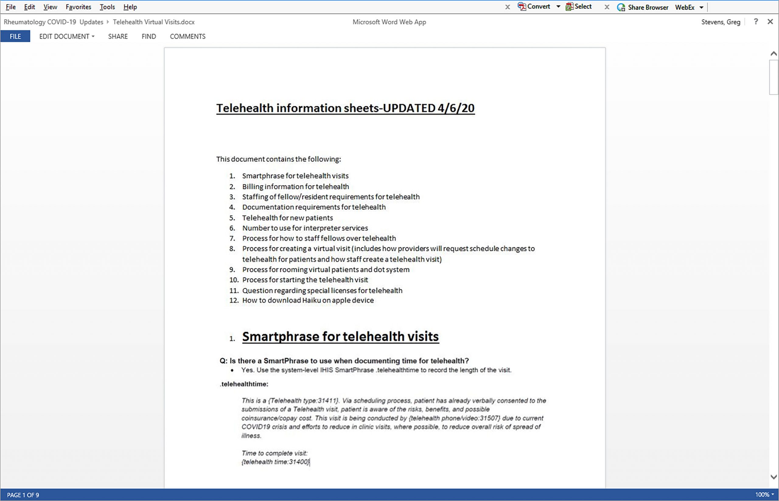 Creating the site required a simple request to our IT department. In less than a day of requesting a Rheumatology COVID-19 Updates SharePoint site, approval was granted. I was soon able to assemble the scores of emails that had filled my in-box and numerous notes scribbled down from meetings into discrete documents that could be stored and shared on the site.