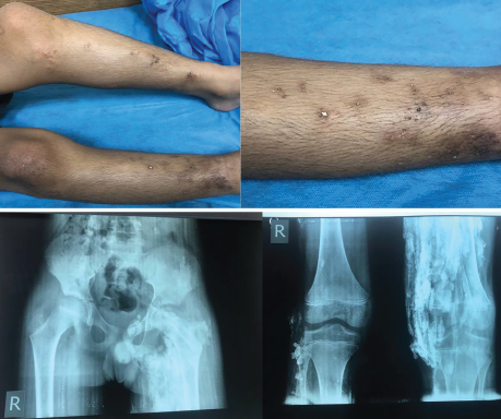 These images depict a 14-year-old boy with a two-year history of proximal muscle weakness affecting both upper and lower limbs, and a skin rash affecting his face. He was diagnosed with juvenile dermatomyositis and developed calcinosis over both legs with skin infection and ulceration. Plain X-ray of both his pelvis and femurs showed reticular pattern calcinosis. He had a poor response to a infliximab.