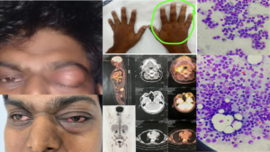 A 39-year-old man presented with progressive dyspnea, erythematous leg nodules, recurrent fevers, weight loss, periorbital swelling and inflammatory arthritis, signs and symptoms he’d experienced starting in October 2021. Initial treatments for suspected pneumonitis and epididymo-orchitis showed partial responses. Positron emission tomography-computed tomography (PET-CT) revealed multi-system involvement, including his lungs, eyes, carotids, heart and bone marrow. Bone marrow biopsy showed erythroid precursors with cytoplasmic vacuoles. Given the persistent systemic inflammation and multi-organ involvement, VEXAS (vacuoles E1 enzyme X-linked auto-inflammatory somatic) syndrome was suspected. Genetic testing confirmed a UBA1 p.Met41Val mutation.