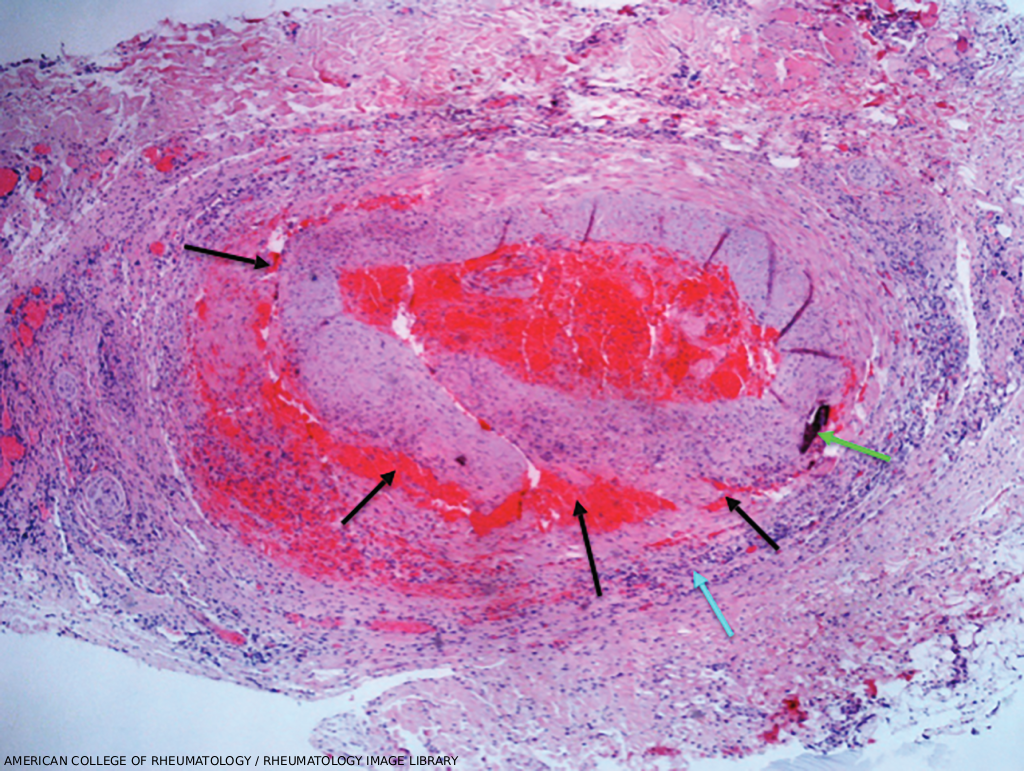 This temporal artery biopsy from a 73-year-old man with jaw claudication and acute vision loss shows vessel wall inflammatory infiltrates (blue arrow) with rare giant cells and loss of the internal elastic lamina. (Click to enlarge.)