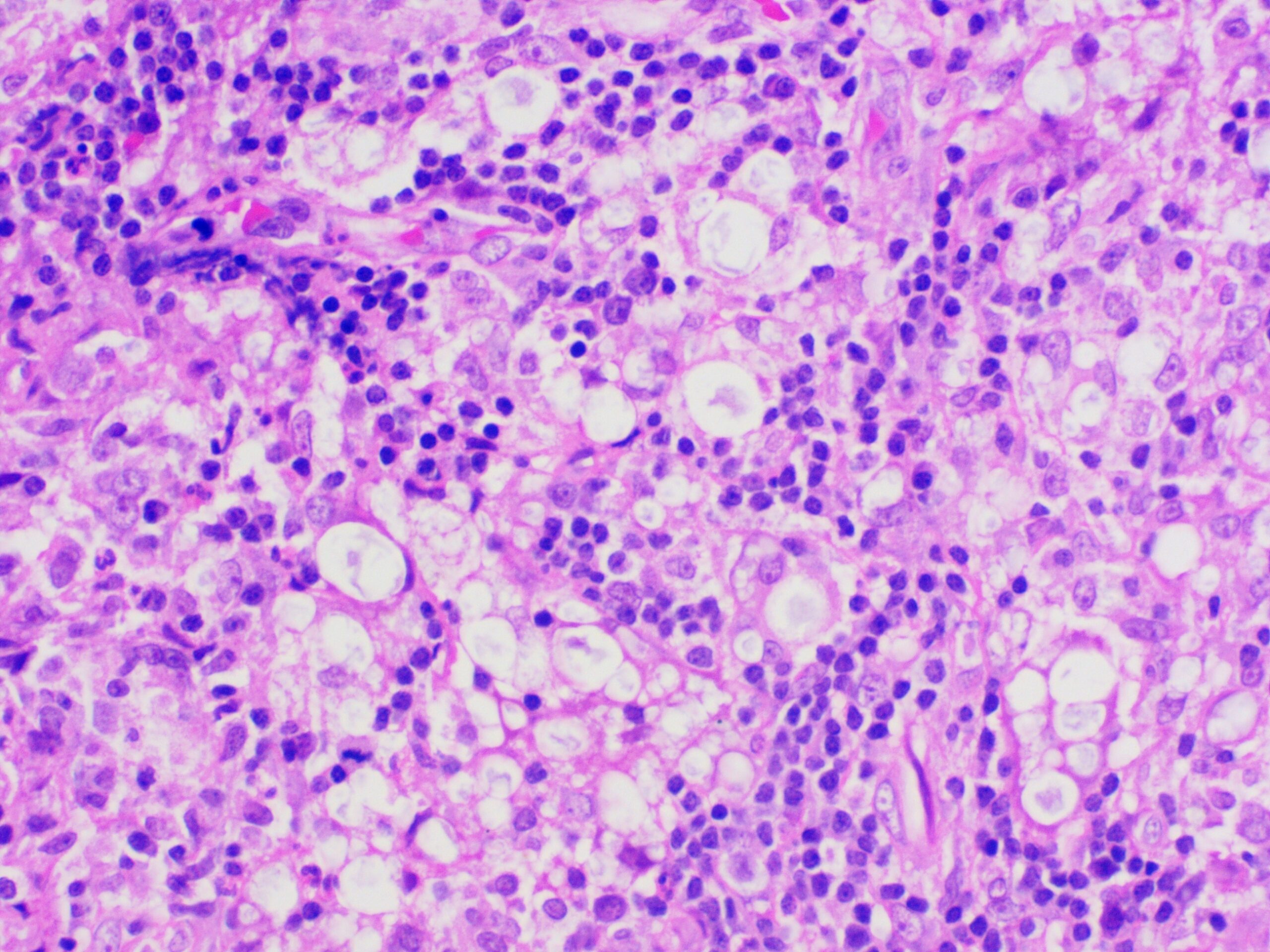 Figure 6: Lymph node biopsy shows foamy macrophages interspersed with lymphocytic infiltrates (lepra or Virchow cells).