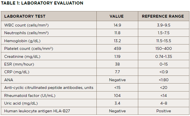 Physical examination & laboratory evaluation: Upon evaluation, the patient was afebrile (98ºF), had a blood pressure of 123/83 mmHg, a heart rate of 90 beats per minute and a normal respiratory rate.