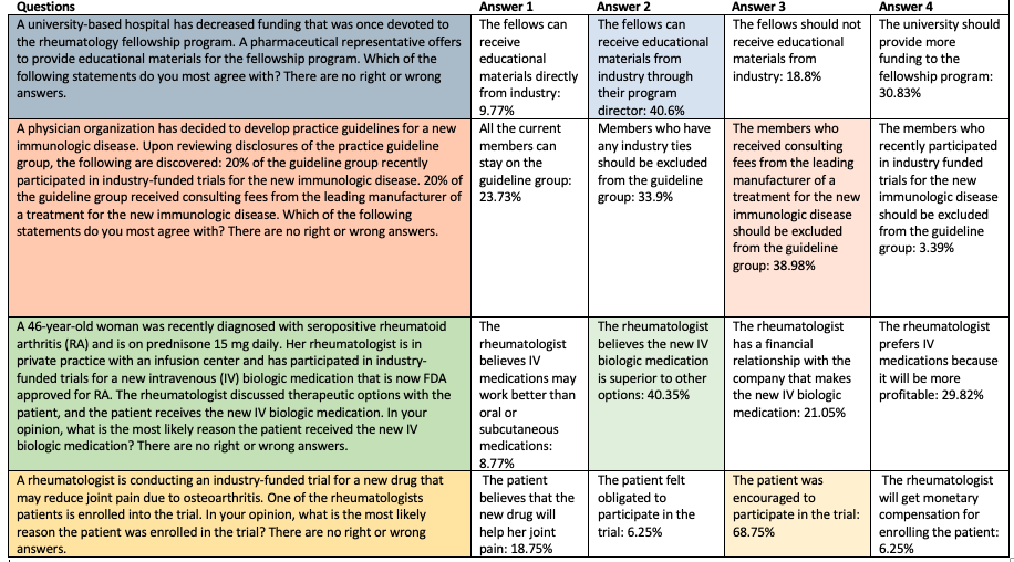 In the final scenario, a rheumatologist is conducting an industry-funded trial on an osteoarthritis drug and a patient is enrolled into the trial. The most popular assessment by far—at 69%—was that the patient was encouraged to participate in the trial, and not that the patient believes the new drug will help her joint pain—a response that was chosen only by about 19% of survey takers.