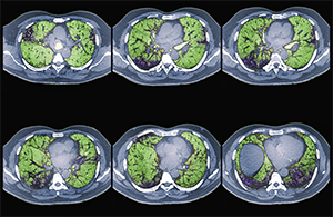 Colored CT scans of axial sections through the chest of a 68-year-old patient with ILD.