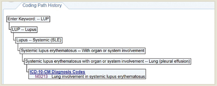 (Click for larger image) Example 2.a.1: Lupus—The coding path history shows the decisions made to obtain the ICD-9 diagnosis codes for lupus.
