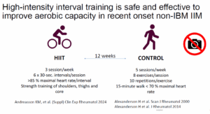 Studies have found that multiple types of HIIT have positive outcomes for patients with myositis and systemic sclerosis as well. HIIT is more effective in improving aerobic capacity compared to home exercise and brisk walks. Helene Alexanderson, PhD, PT, an associate professor at Karolinska University Hospital in Stockholm, Sweden, called HIIT a kind of “disease modifying drug” that is underused.