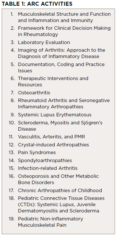 The ARC is designed to provide comprehensive, advanced educational content to professionals who wish to expand their knowledge and clinical skill sets in rheumatology with a strong focus on information that will help NPs and PAs contribute to the clinical practice of rheumatology and foster interprofessional collaboration.